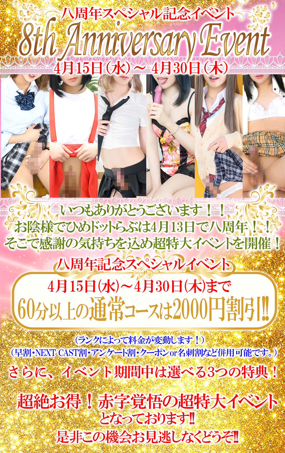 【8周年記念イベント開催】新年度はじまる!!4月のひめらぶ新イベントは激アツな特典盛りだくさん!!通常コース選べる3つの特典!!復活💕